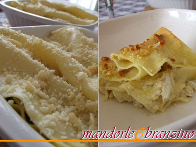 Ho composto a strati le lasagne (filetto di branzino, salsa, pasta, ecc…) finendo con una spolverata di mandorle tritate e un filo d’olio evo.